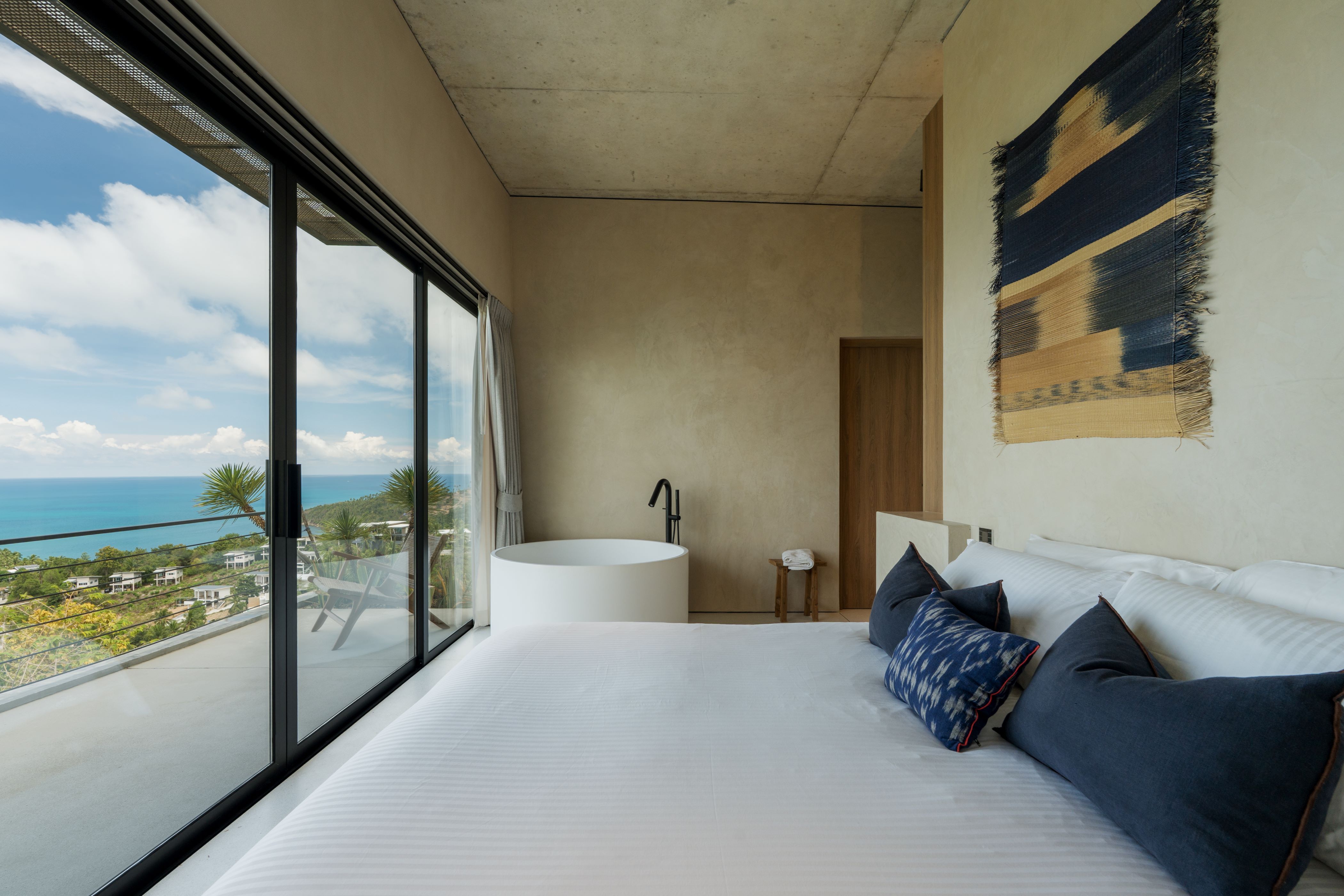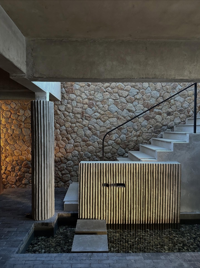 通过热闹的鸡尾酒吧,来到象征第二个元素——水的二楼用餐空间。就像水作为媒介,溶解并重构食材的分子,家人和朋友围坐在圆桌旁,享受美食和共同度过美好时光。二楼四周的玻璃砖壁龛利用了被相邻建筑遮挡的原始建筑窗户的深度,壁龛中展示了被树脂块包裹的原石,抽象地象征了食物分子在液体中被融合重组的形态。这层楼同样保留了原建筑扩建后被归为室内空间的带有石窗框的旧墙,作为用餐空间之间的隔断,木屋顶结构和沿街阳台也被小心修缮后保留和展露出来。