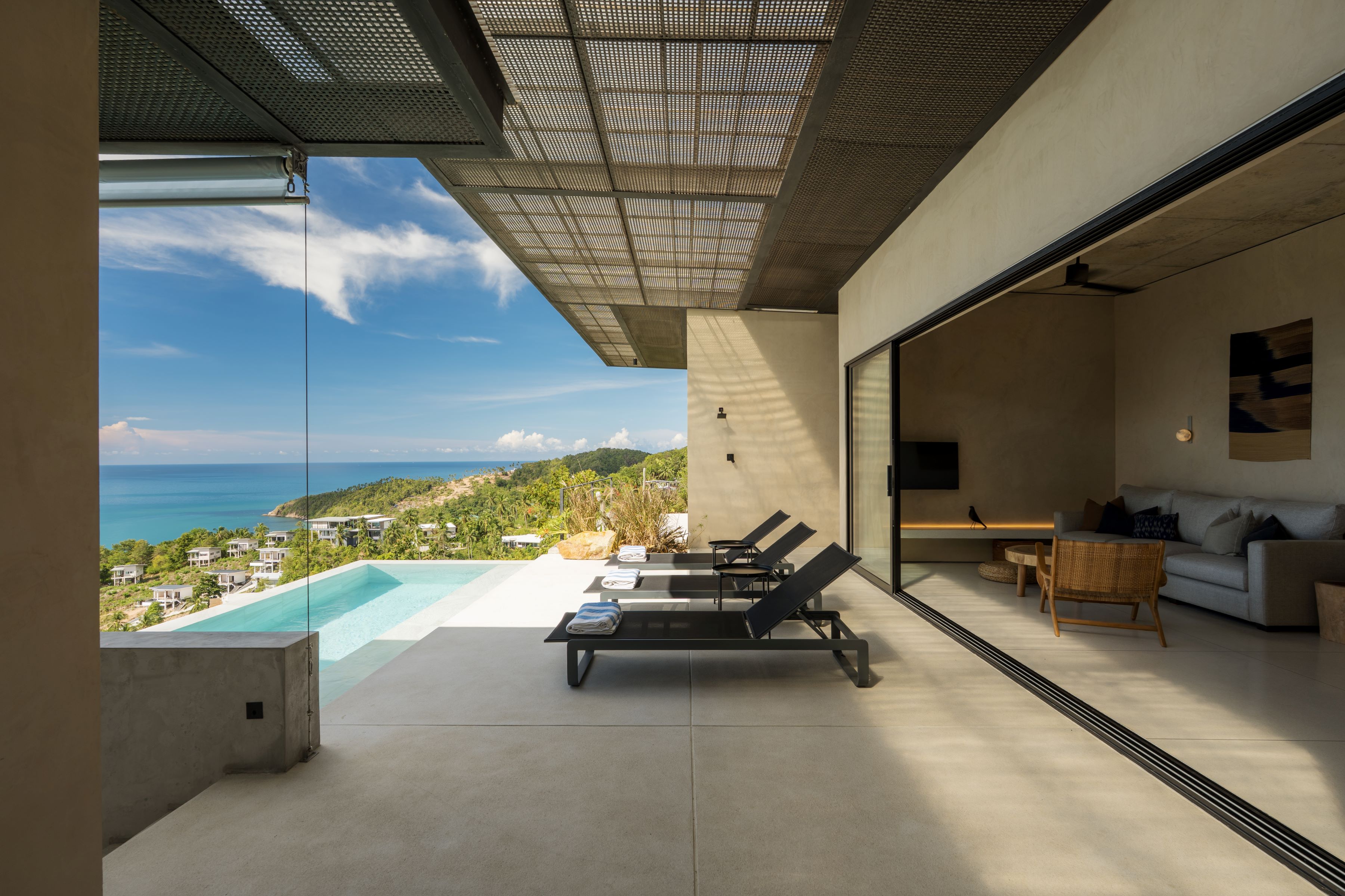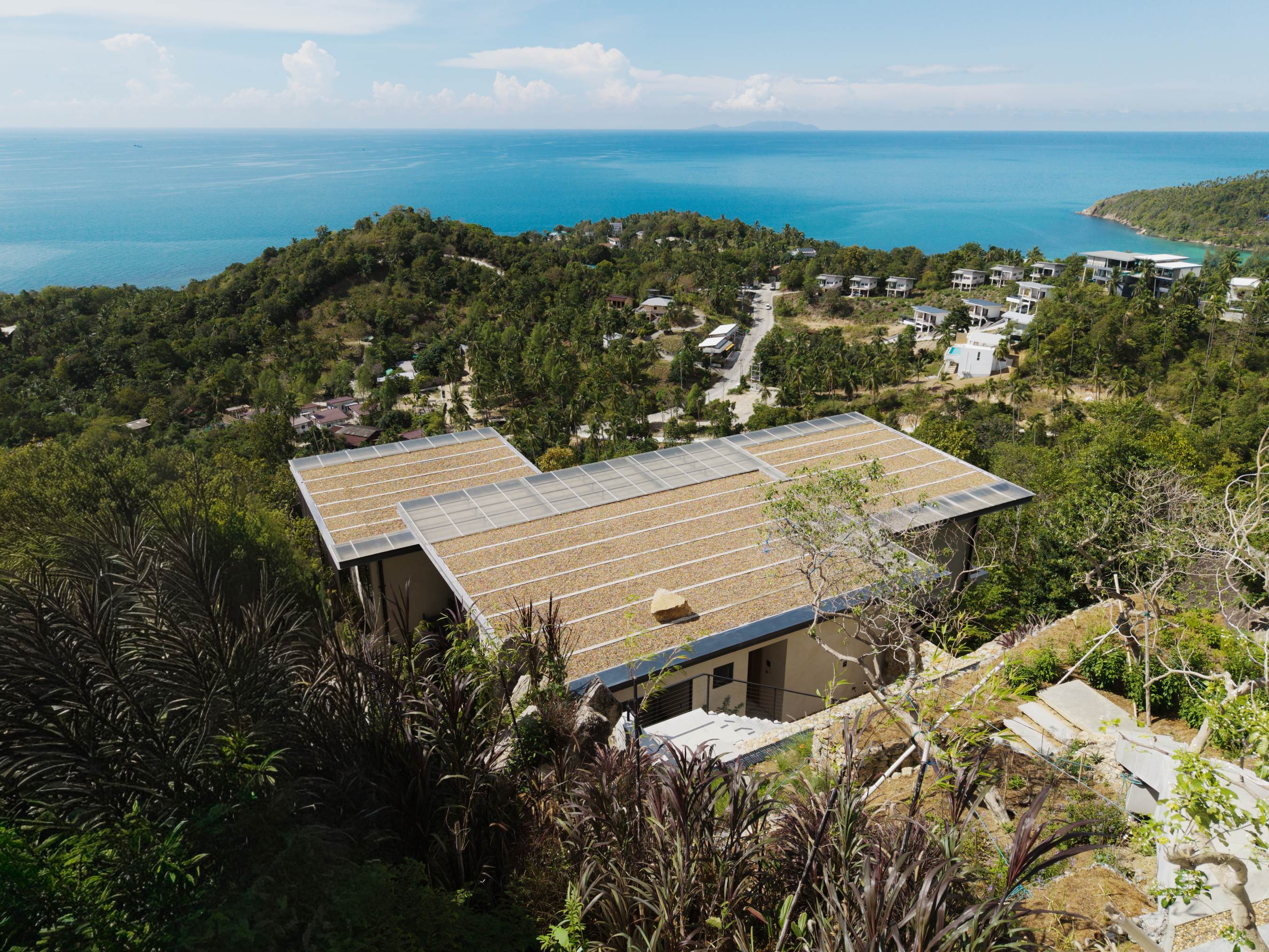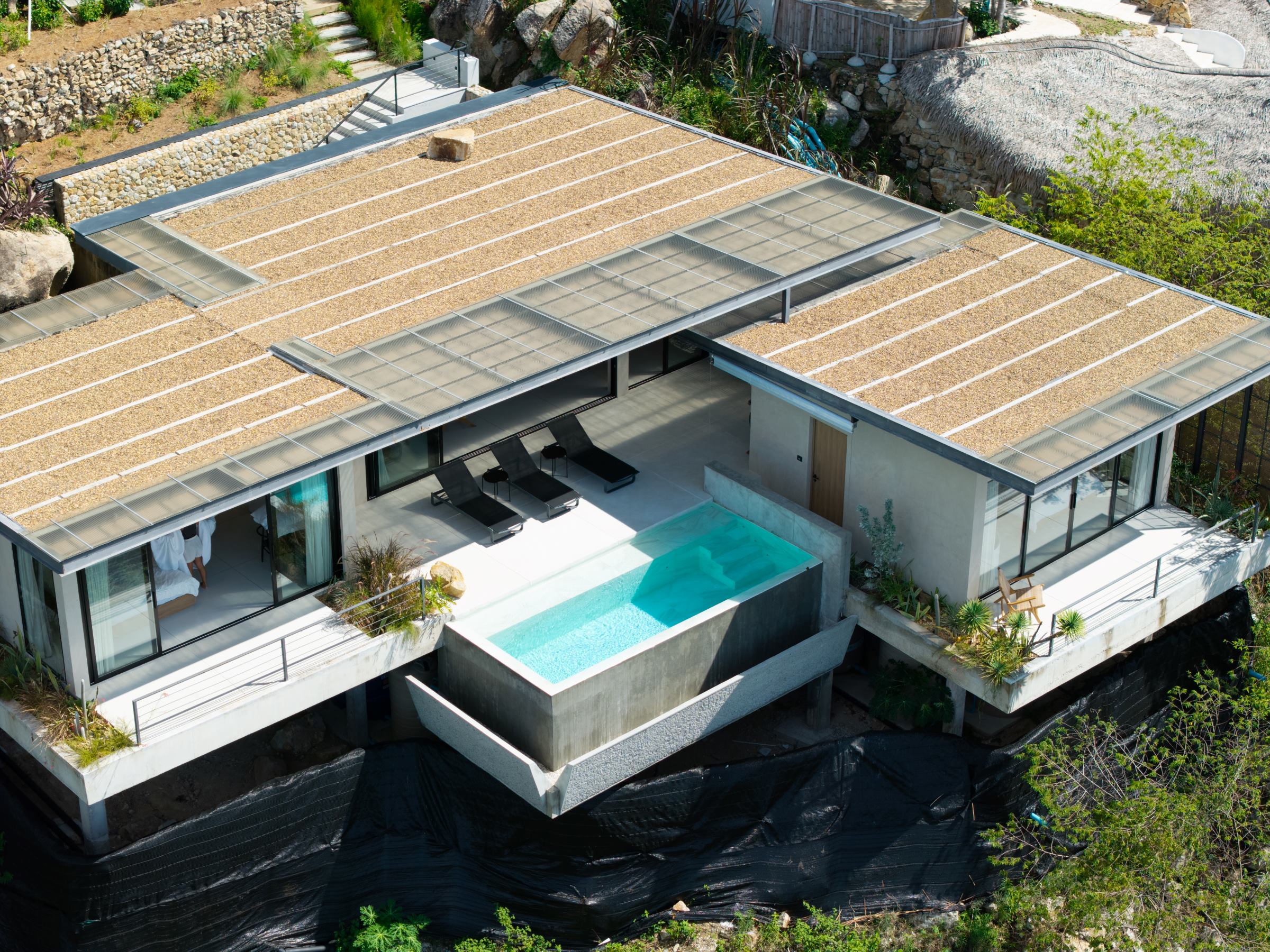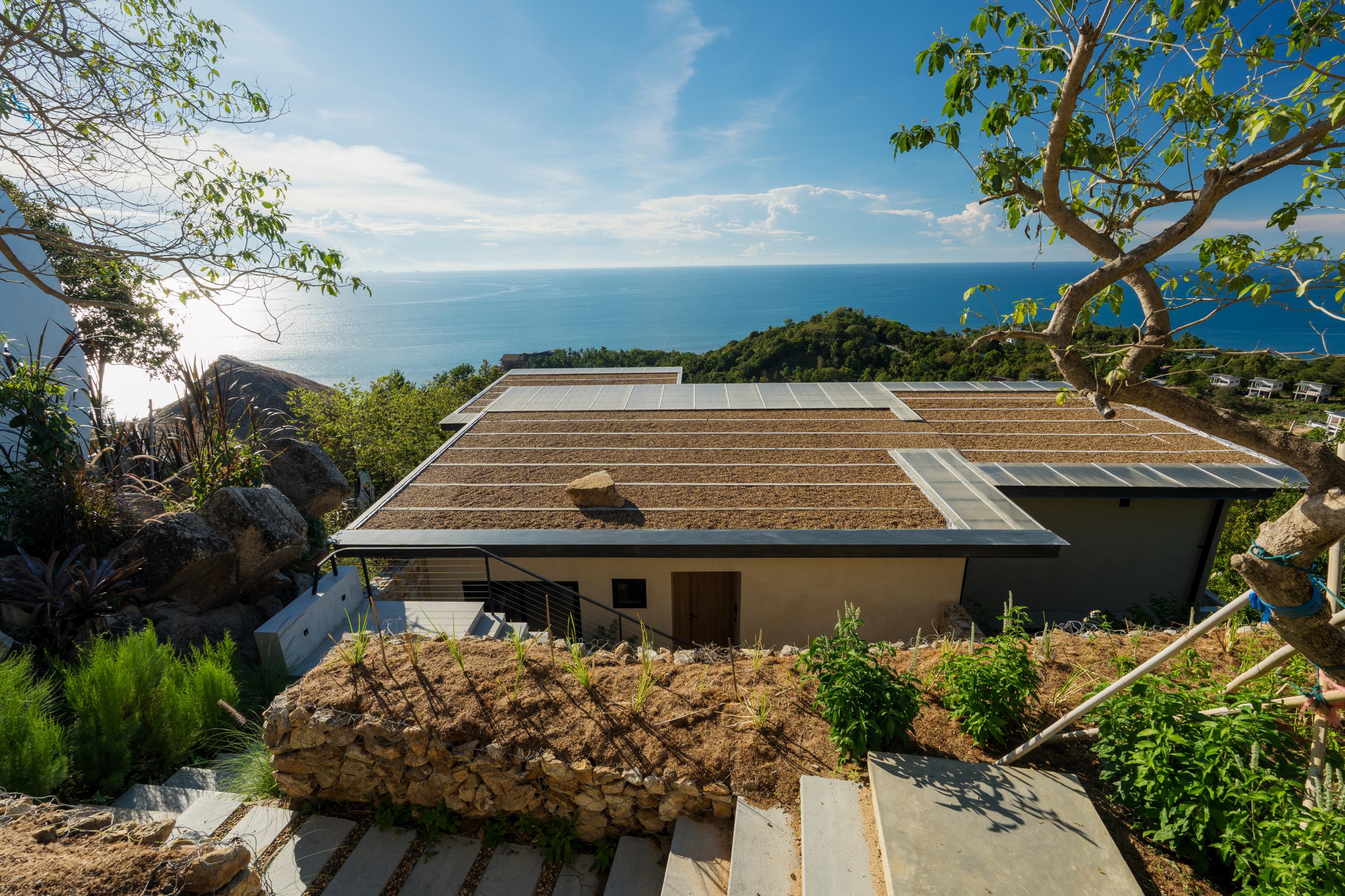 The old wooden stairs of the villa were very narrow, steep and badly damaged, couldn’t serve the current F&B function. For better circulation, the architects relocated the vertical connection of the building to the patio space of the existing building extension. To enhance the experience, the new staircase is covered with double glazed U-shaped glass partitions along all floors with a lighting system to represent the continuous energy flow transition, at the end of which is the terrace space and a more exclusive private VIP room. Here, the customers are reconnected with the city and able to look at it from the different heights and angles, corresponding to the last element – steam – elevation of taste. The simply designed interior shows off the geometric shape of the attic, while benches on the roof allow customers to have a more exclusive interaction with the city.