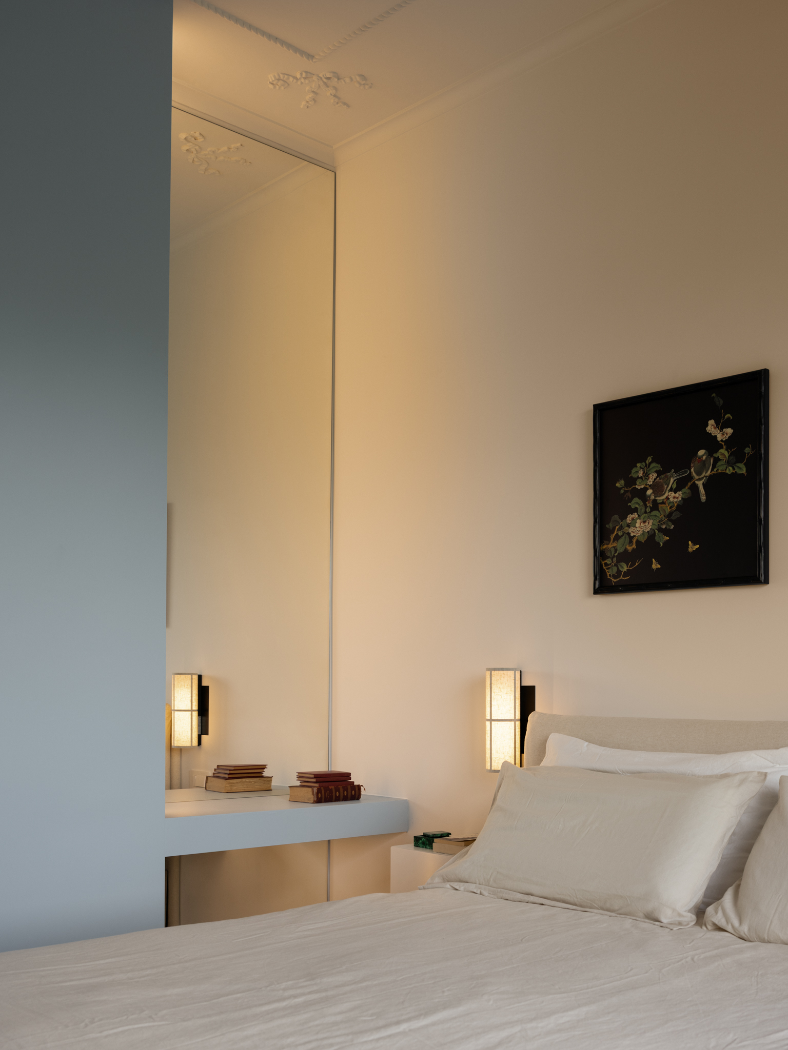 In the living room, artworks in shades of blue—the clients’ preferred color—are illuminated by wall lamps from our own brand, Cao Zi Tou, establishing a delicate equilibrium between East and West.